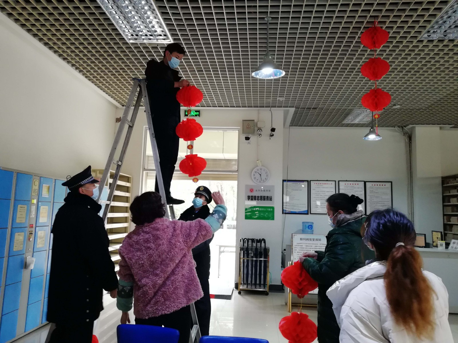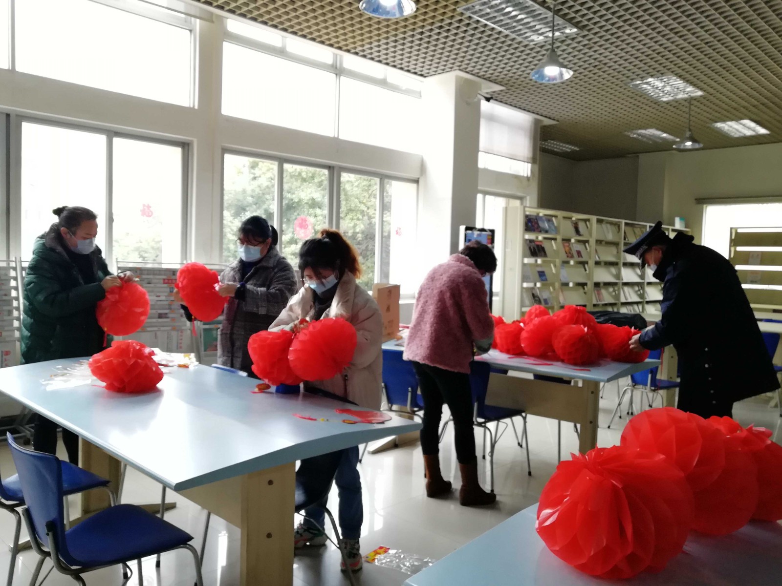 五华区图书馆职工在贴窗花、挂灯笼,营造节日氛围。