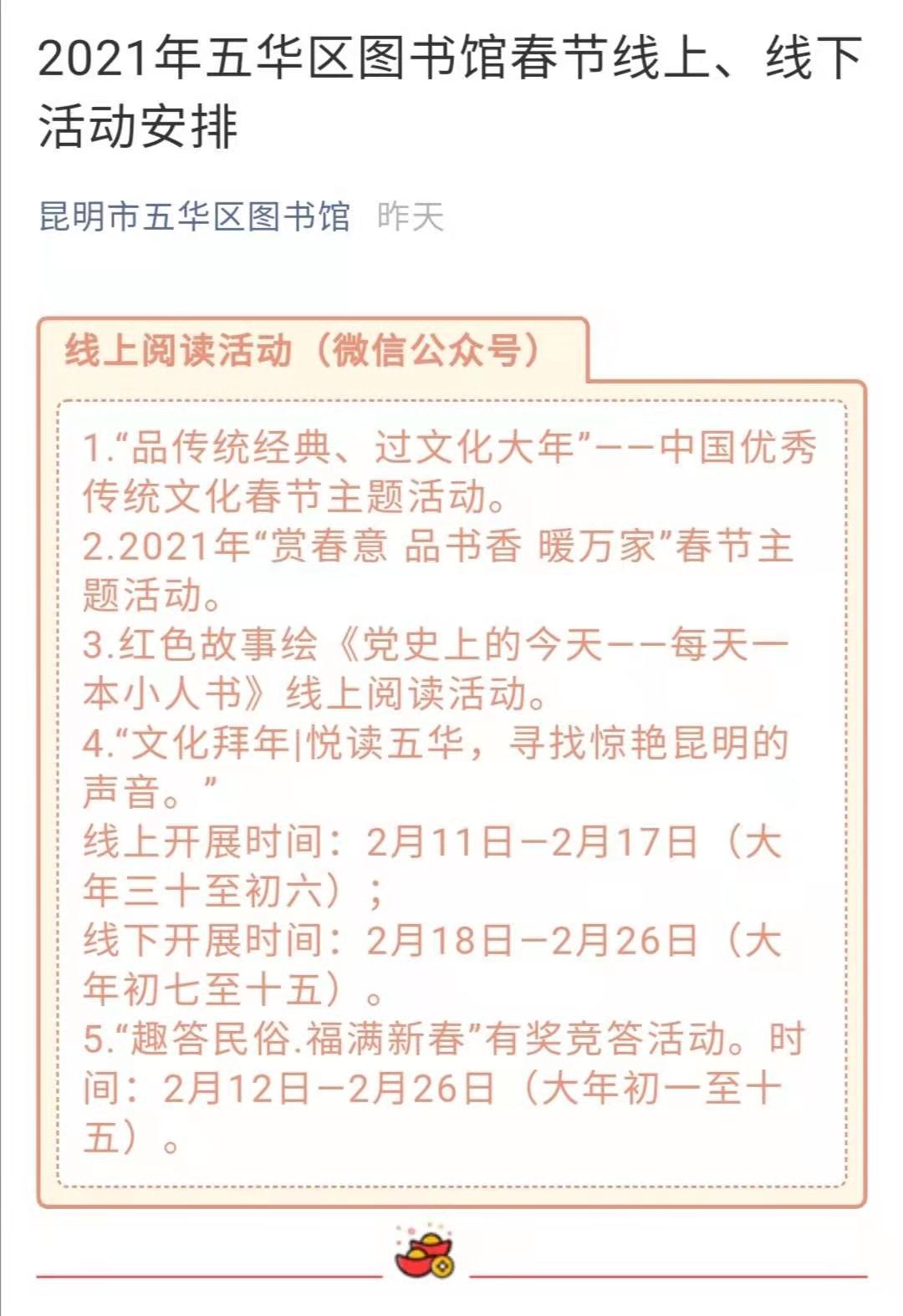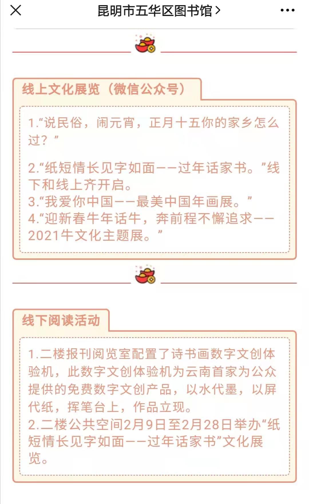 春节期间,读者可通过五华区图书馆微信公众号参与以下线上阅读活动:一是“品传统经典、过文化大年”——中国优秀传统文化春节主题活动;二是2021年“赏春意 品书香 暖万家”春节主题活动;三是红色故事绘《党史上的今天——每天一本小人书》线上阅读活动;四是“文化拜年|悦读五华,寻找惊艳昆明的声音!”;五是“趣答民俗.福满新春”有奖竞答活动。线上文化展览有:一是“说民俗,闹元宵,正月十五你的家乡怎么过?”;二是“纸短情长见字如面——过年话家书”线下和线上齐开启;三是“我爱你中国——最美中国年画展”;四是“迎新春牛年话牛,奔前程不懈追求——2021牛文化主题展”。线下阅读活动有:二楼