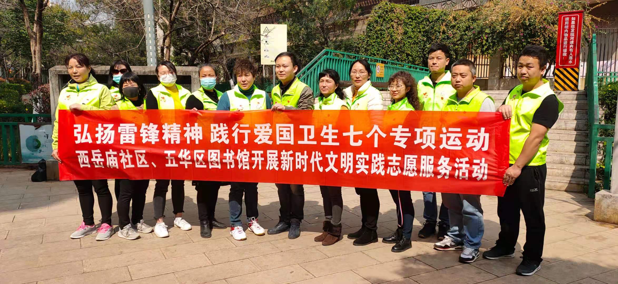 为大力弘扬传承雷锋精神和习近平总书记引导的奉献友爱,互助进步的志愿精神,美化居住环境,服务社区居民。3月3日下午,在全国第58个学雷锋日到来之际,五华区图书馆党支部组织全馆党员志愿者和入党积极分子,与西岳庙社区的党员志愿者联合开展了“学雷锋,美环境”主题党日志愿服务活动。
