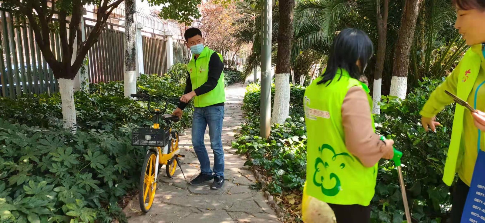 志愿者将不规范停放的共享单车摆放到附近的集中停放区