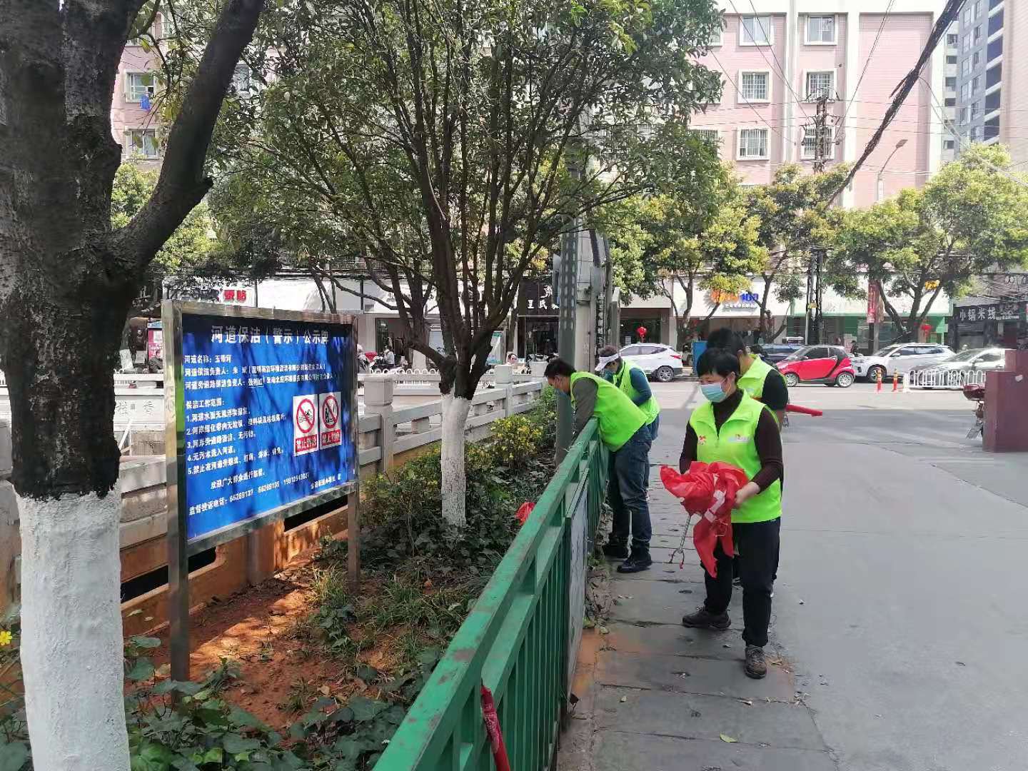 活动中,志愿者们不怕脏、不怕苦、不怕累,发扬着雷锋精神,分为三组顺着玉带河沿岸,对沿街商户发放“爱国卫生七个专项运动”宣传册,清除小广告及破旧布标,将不规范停放的共享单车摆放到附近的集中停放区,捡拾公共场所垃圾、清理河道沿岸垃圾等志愿服务活动。经过两个多小时的努力,玉带河沿岸的垃圾、小广告、破旧布标、共享单车已经基本清理干净,河道焕然一新。