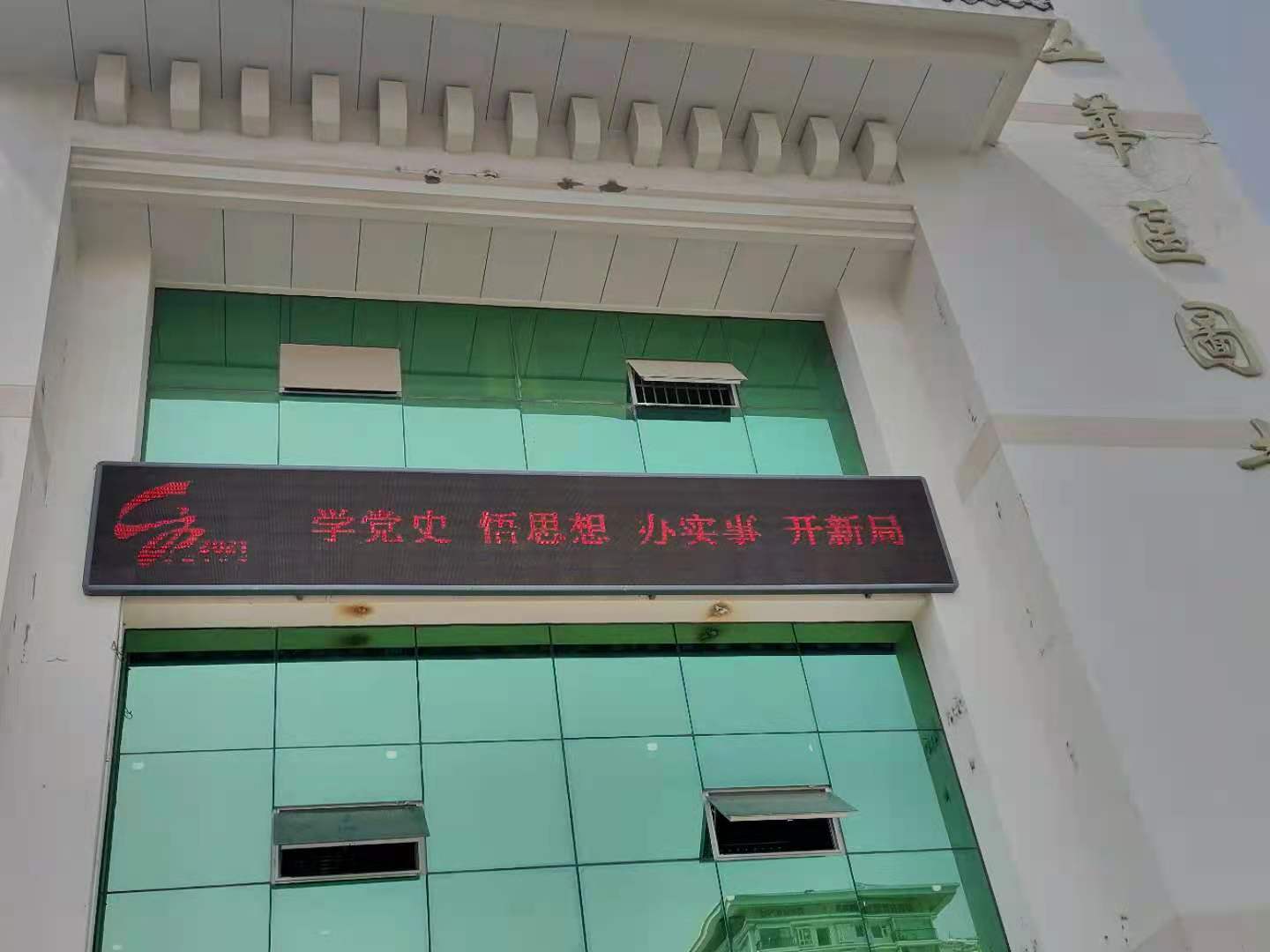 站在西寺塔广场就能看到“学党史、悟思想、办实事、开新局”LED屏的宣传标语;沿着大楼梯来到二楼报刊门口,一副“辉煌百年、砥砺前行、不忘初心、牢记使命”巨幅海报映入眼帘。