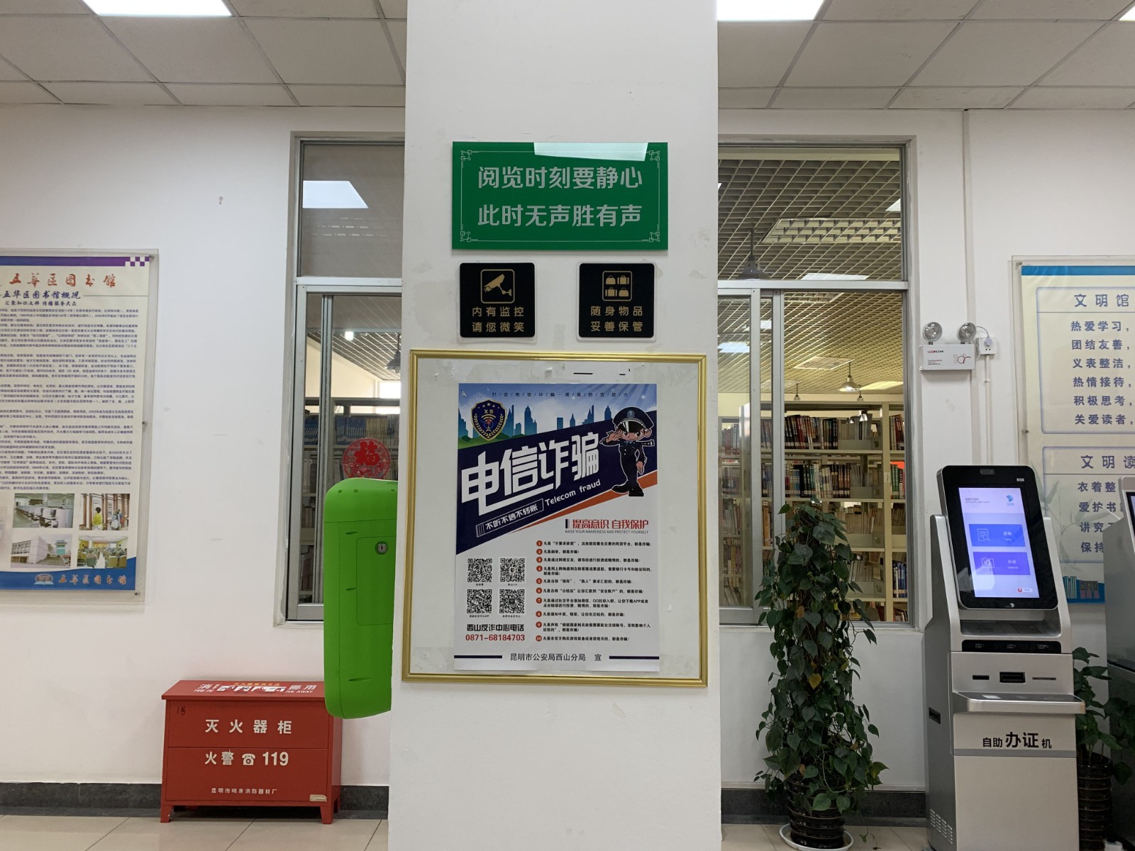 为进一步提升广大市民的防骗意识和反诈能力,有效减少电信网络诈骗案件的发生,五华区图书馆认真落实区文旅局通知精神,全面展开多形式的防范电信网络诈骗宣传工作,通过“线上”微信公众号转发反诈骗典型案例、反诈知识、推送国家反诈中心APP和“金钟罩”小程序二维码,“线下”在图书馆各主要出入口宣传栏内张贴防骗宣传海报,利用LED屏滚动播出反诈宣传标语1条,窗口工作人员手把手指导市民安装“金钟罩”小程序。切实将反诈宣传工作落到实处。