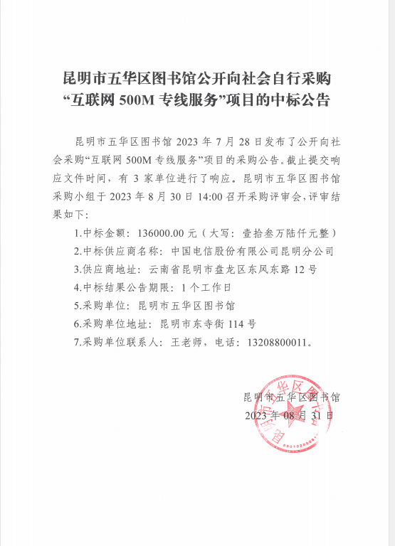昆明市五华区图书馆公开向社会自行采购 “互联网500M专线服务”项目的中标公告