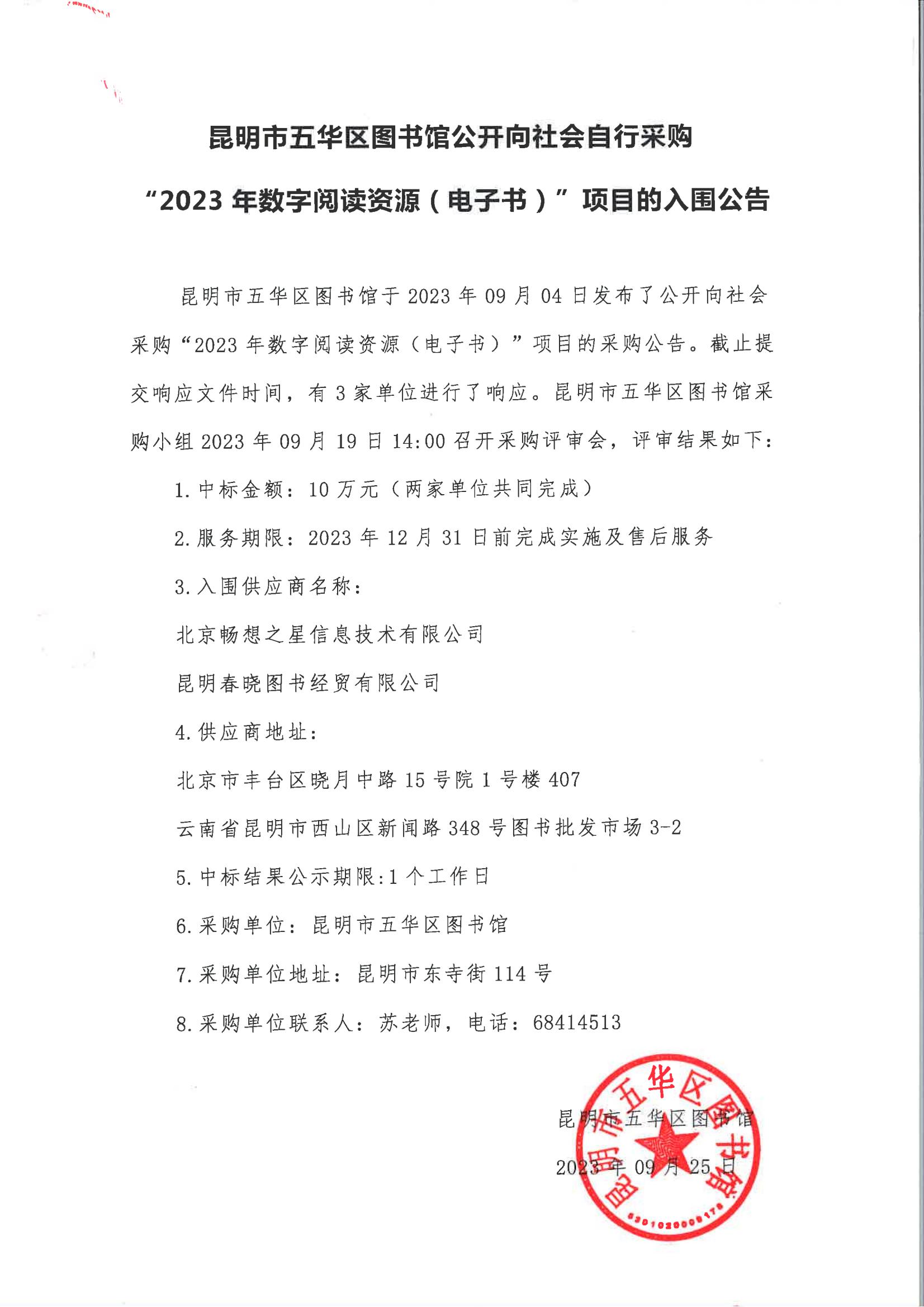 昆明市五华区图书馆公开向社会自行采购“2023年数字阅读资源(电子书)”项目的入围公告