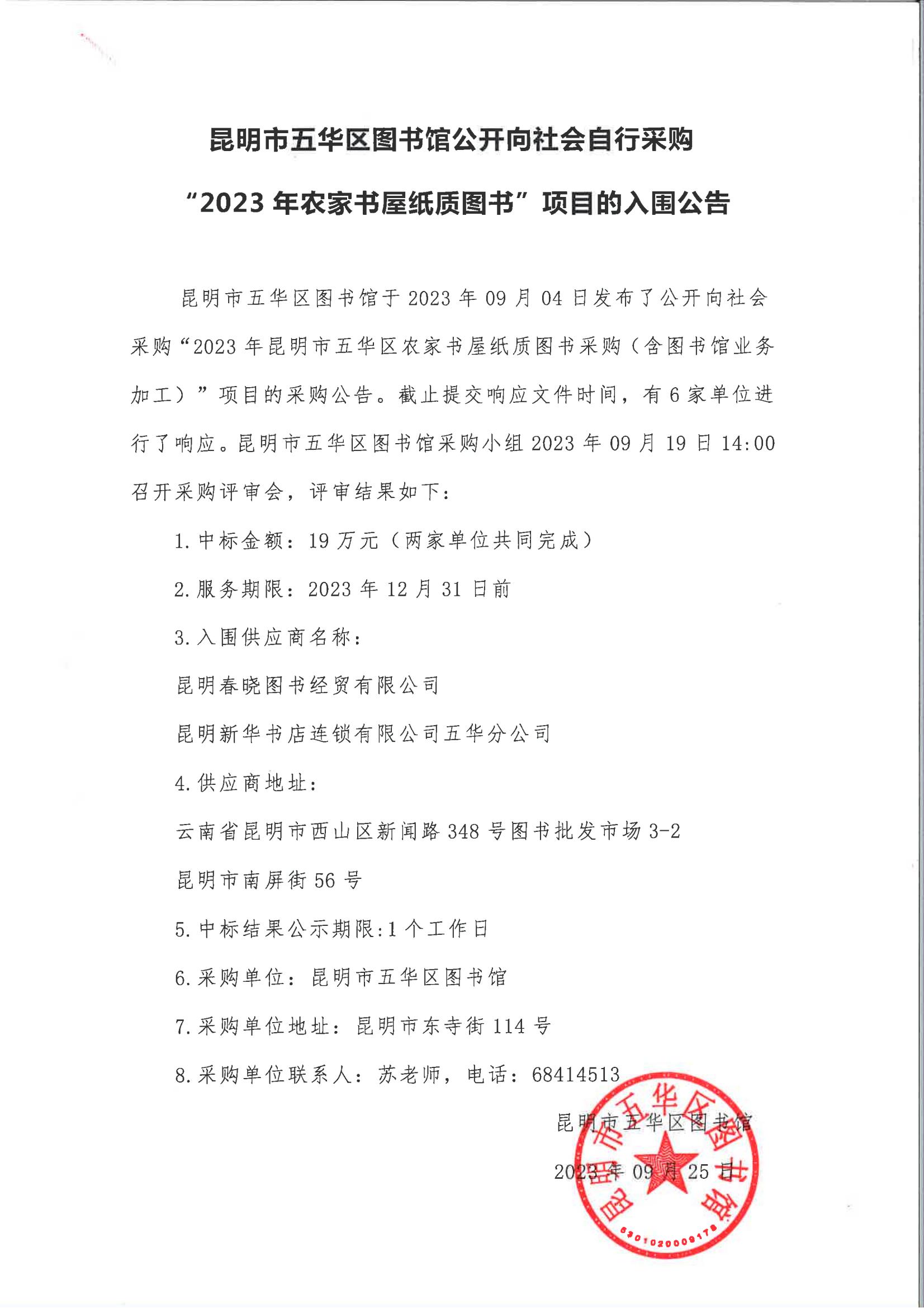 昆明市五华区图书馆公开向社会自行采购“2023年农家书屋纸质图书”项目的入围公告