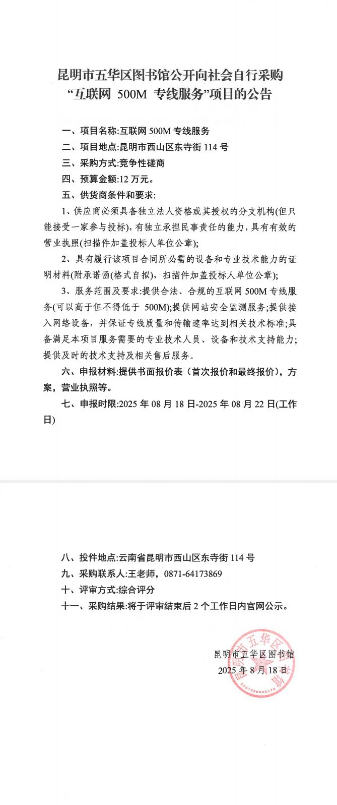 昆明市五华区图书馆公开向社会自行采购“互联网 500M 专线服务”项目的公告